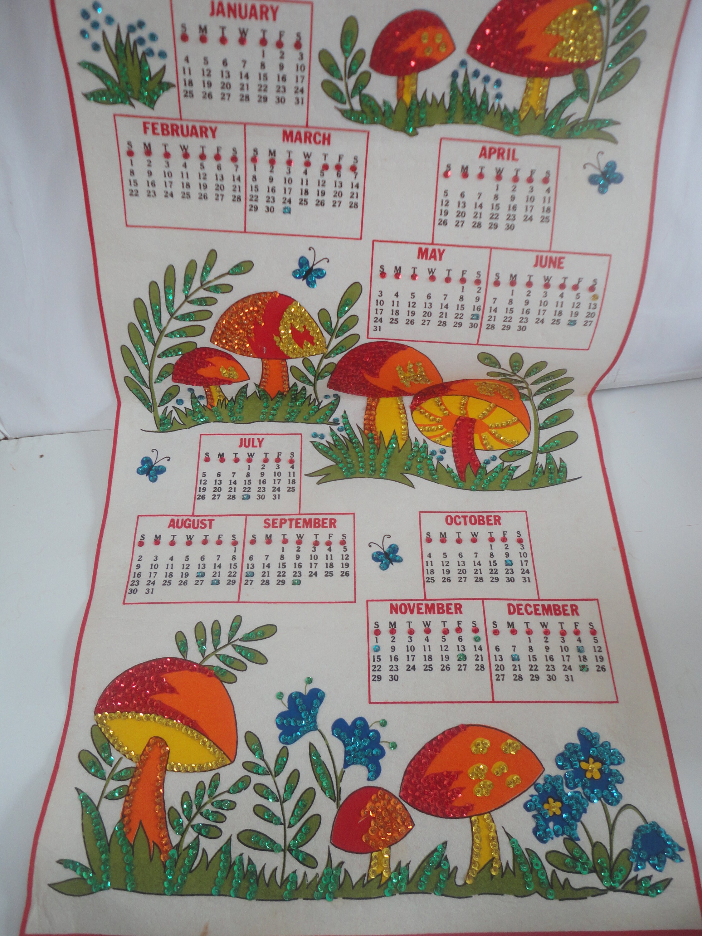 Source : www.amazon.comVintage Handmade Loud Orange Blue Sequence Mushroom Calendar, 1981